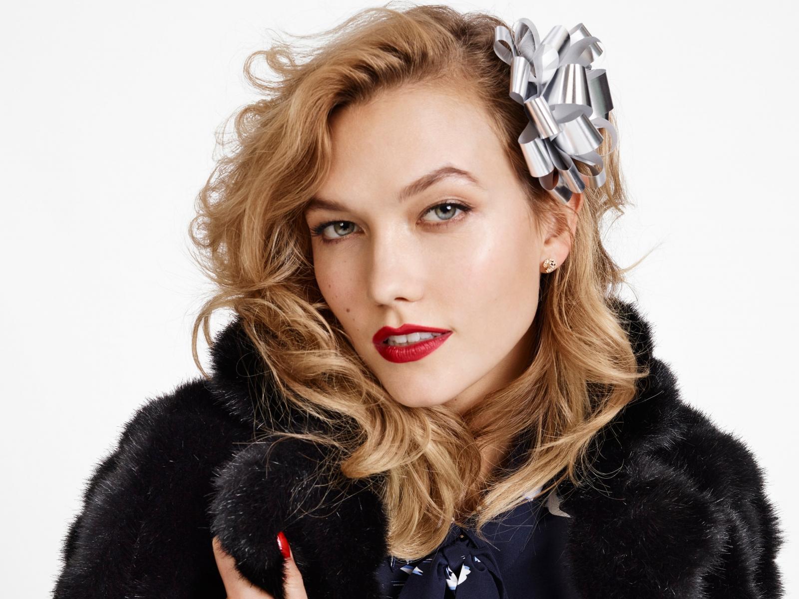 Wallpaper Model Karlie Kloss in a black fur coat on a white background