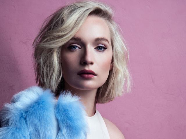 Wallpaper Brightly blue-eyed girl model on a pink background