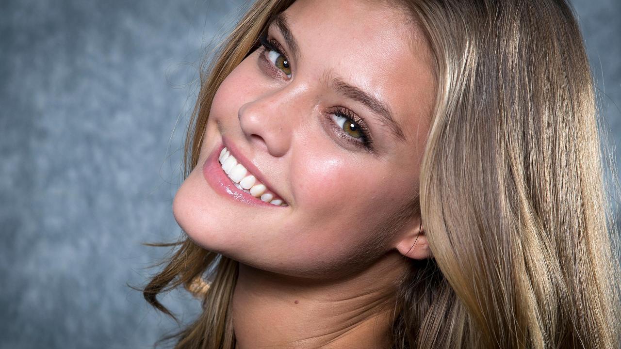 Wallpaper Smiling model Nina Agdal face close-up.