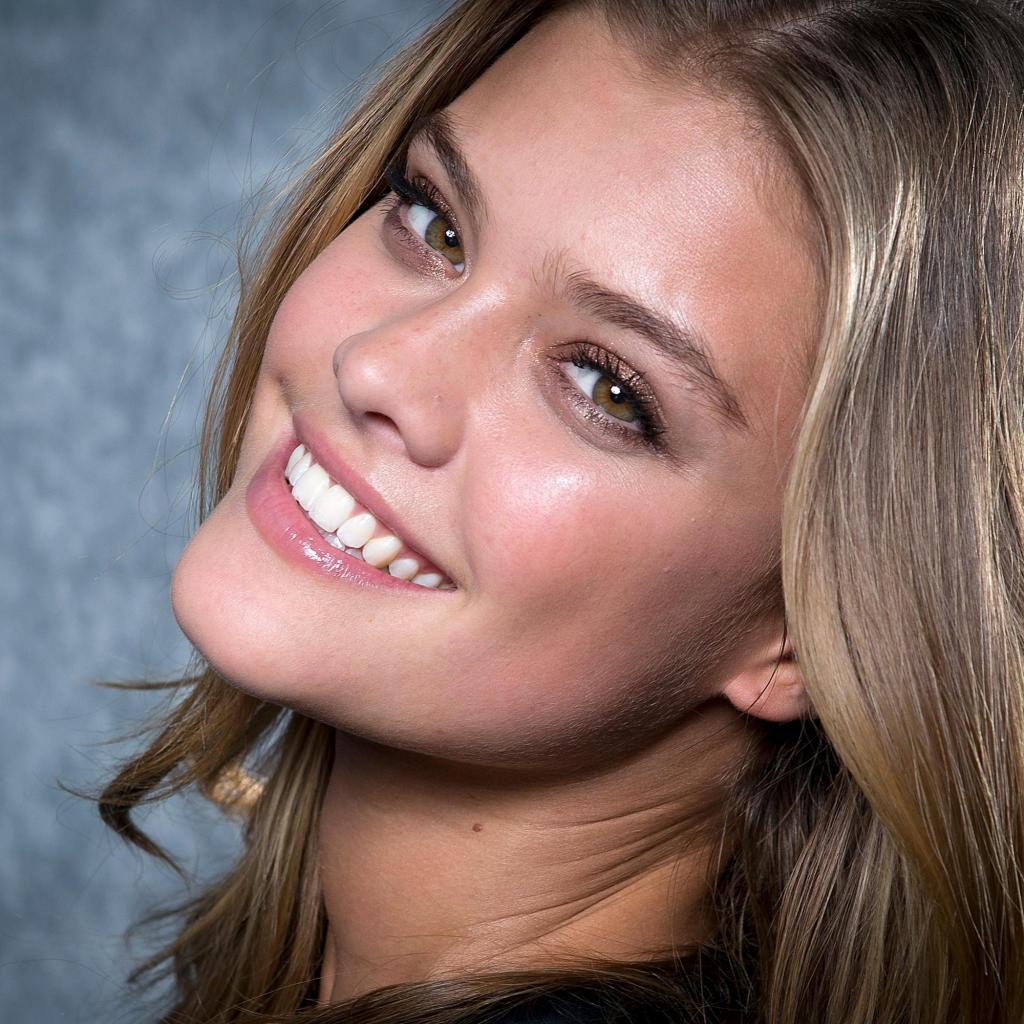 Wallpaper Smiling model Nina Agdal face close-up.