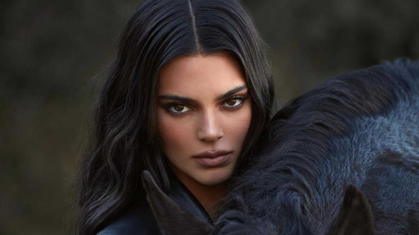Wallpaper Long-haired girl model Kendall Jenner with a horse