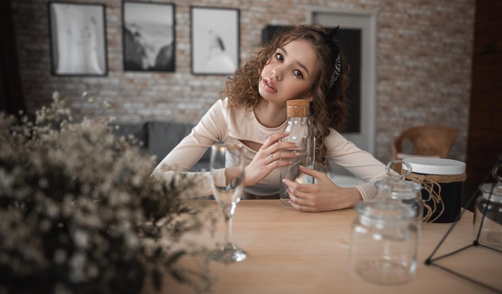 Wallpaper Young girl model sits in a cafe at the table