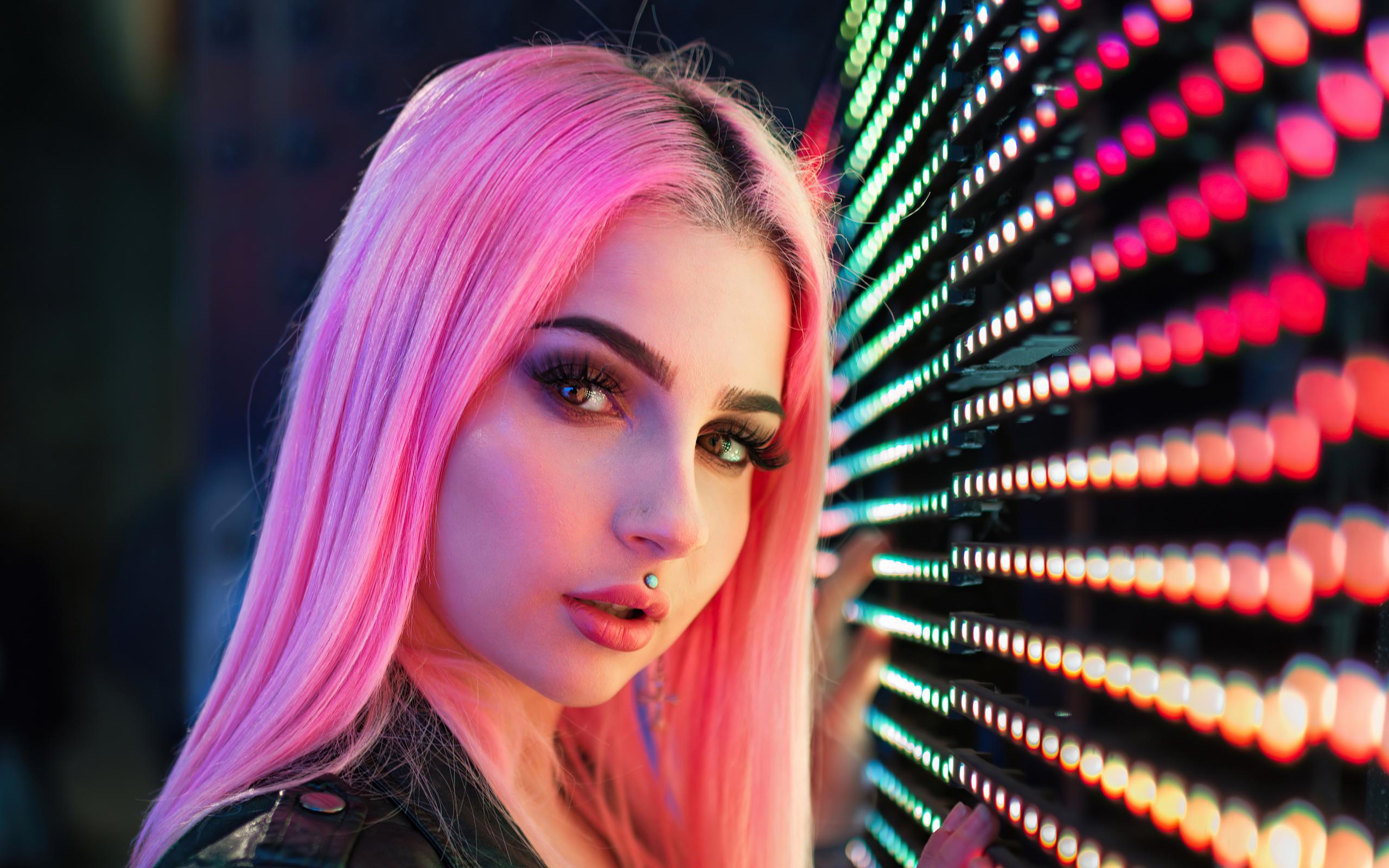 Wallpaper Beautiful girl with pink hair with light bulbs on the wall