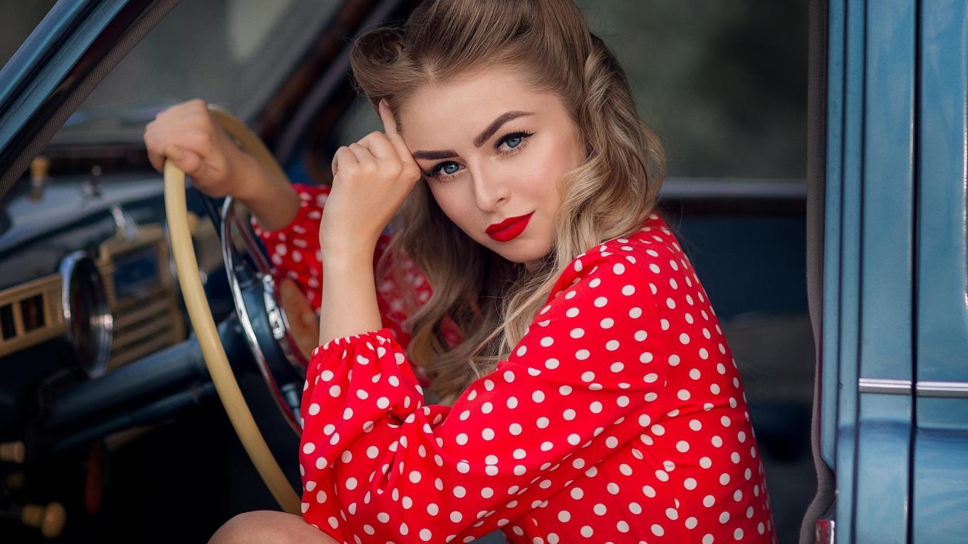 Wallpaper Blue-eyed retro girl driving a car
