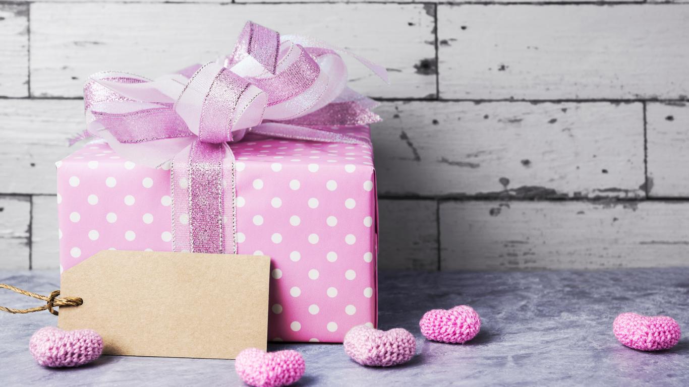 Wallpaper Large lilac gift box with a bow and small hearts against the wall