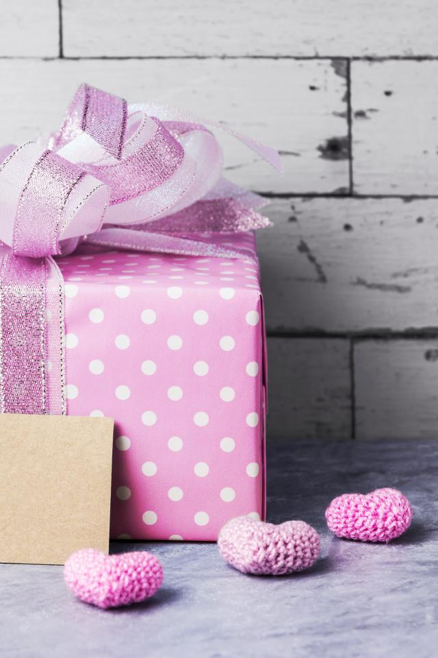 Wallpaper Large lilac gift box with a bow and small hearts against the wall