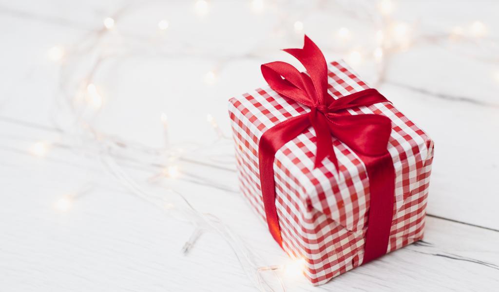 Wallpaper Gift with red ribbon lies on the table with a garland