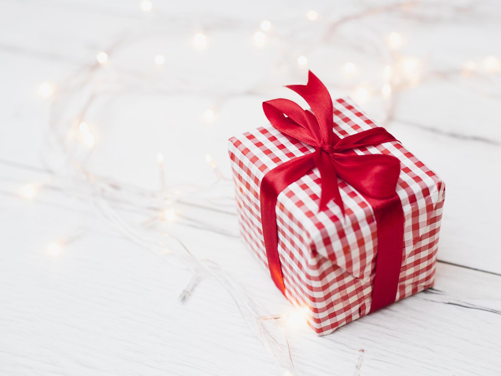 Wallpaper Gift with red ribbon lies on the table with a garland