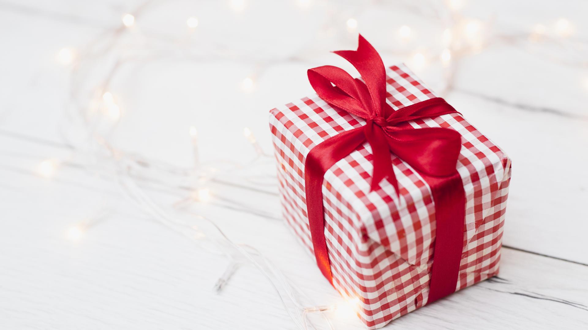 Wallpaper Gift with red ribbon lies on the table with a garland
