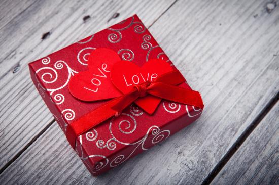 Wallpaper Gift with red hearts on a wooden table