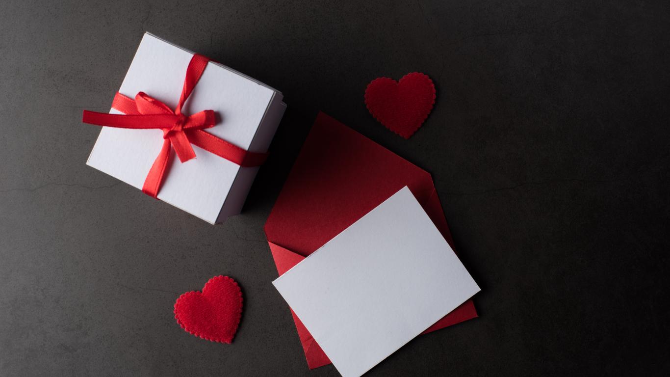 Wallpaper Envelope and gift on a gray table with red hearts.