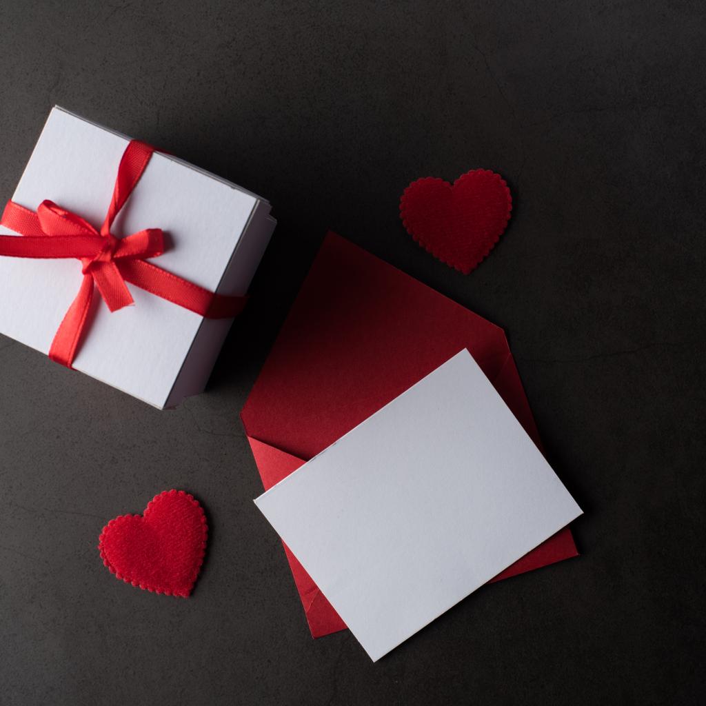 Wallpaper Envelope and gift on a gray table with red hearts.