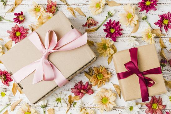 Wallpaper Two boxes with gifts on a table with chrysanthemum flowers