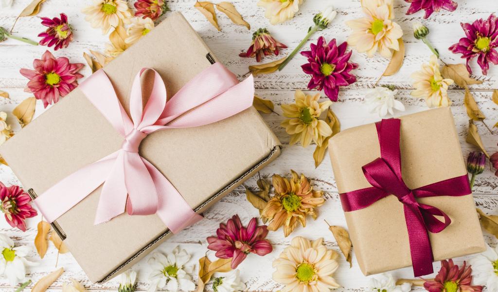 Wallpaper Two boxes with gifts on a table with chrysanthemum flowers