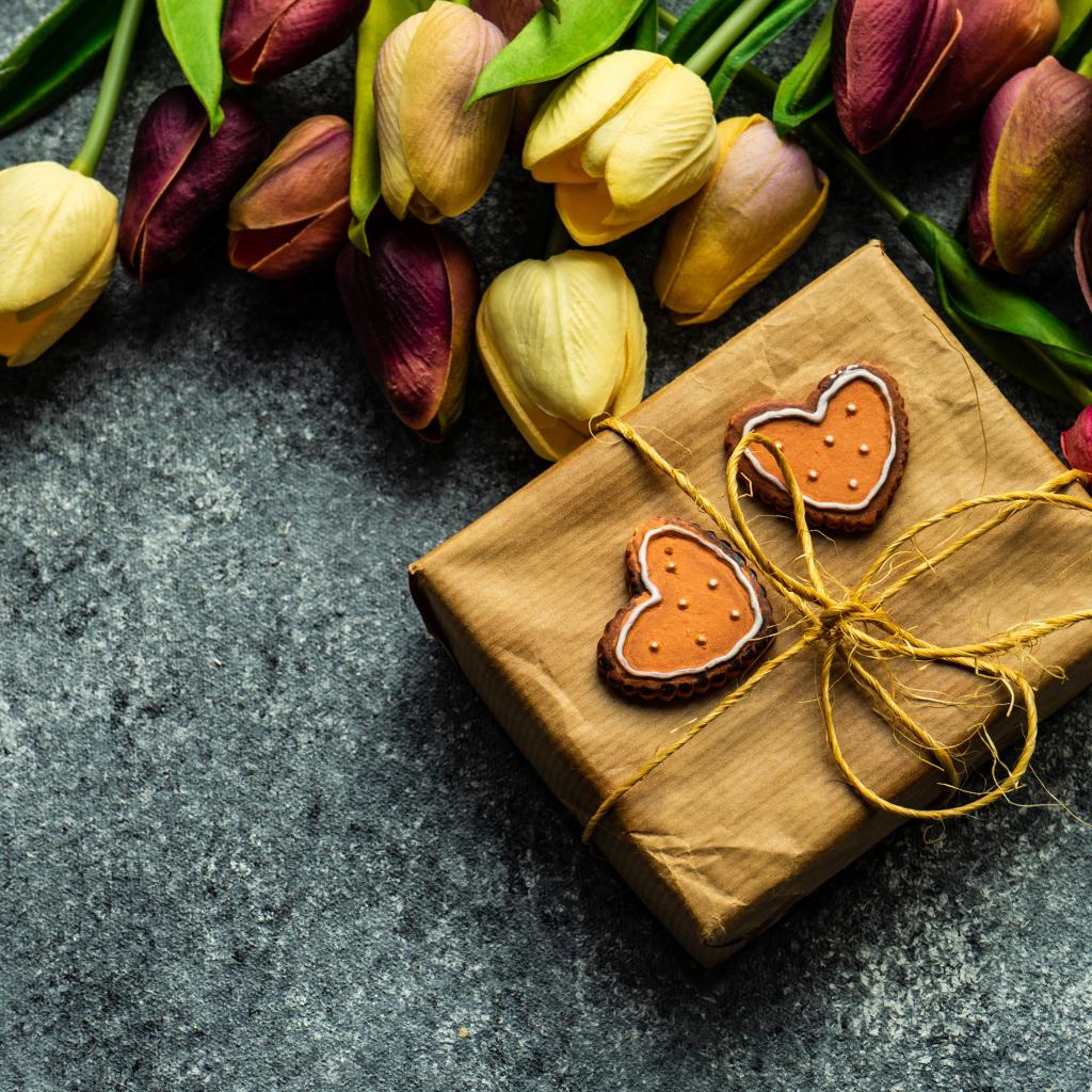 Wallpaper Gift with a bouquet of tulips on a gray table