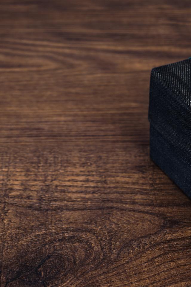 Wallpaper Gift with a blue bow on a wooden table