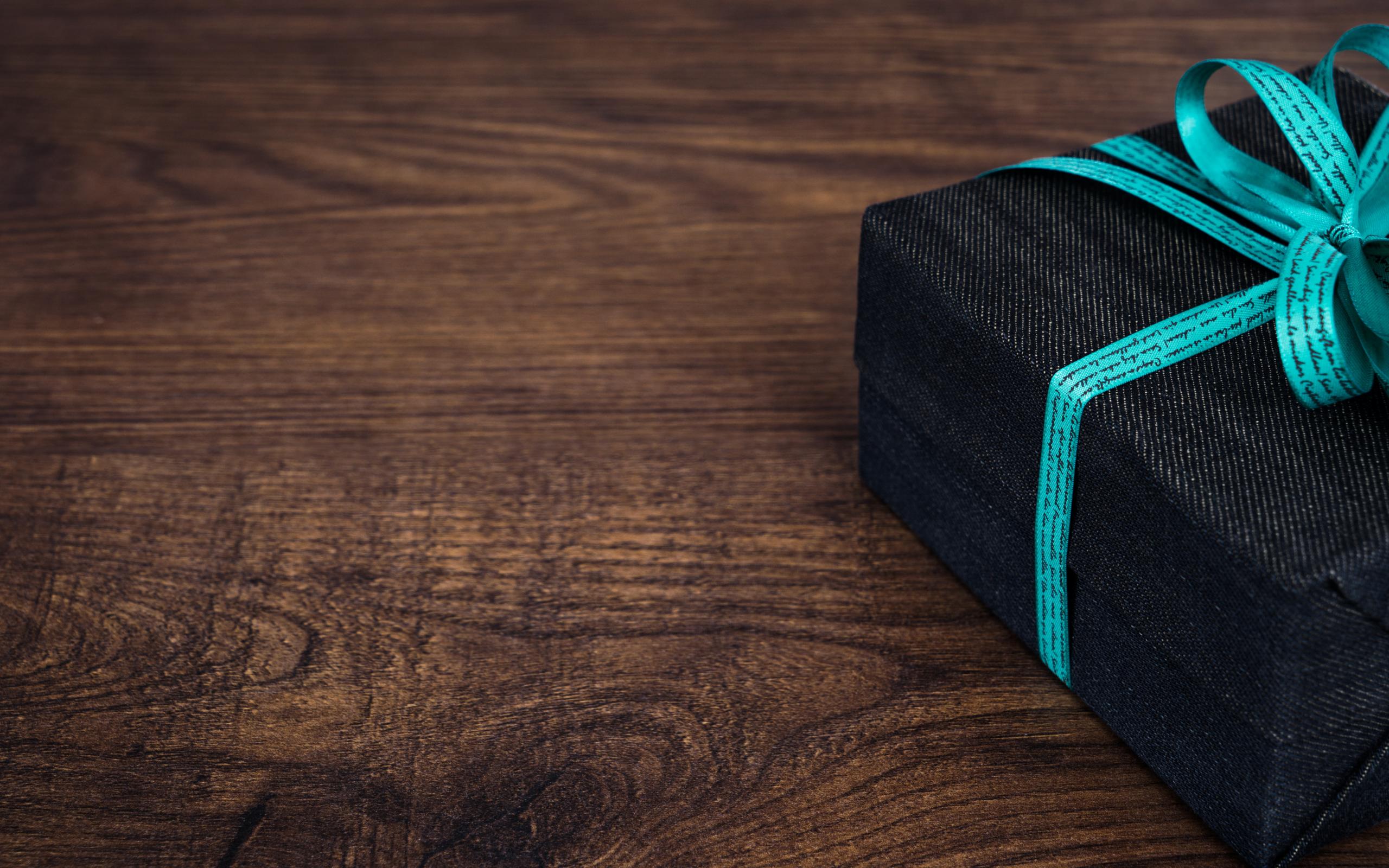 Wallpaper Gift with a blue bow on a wooden table