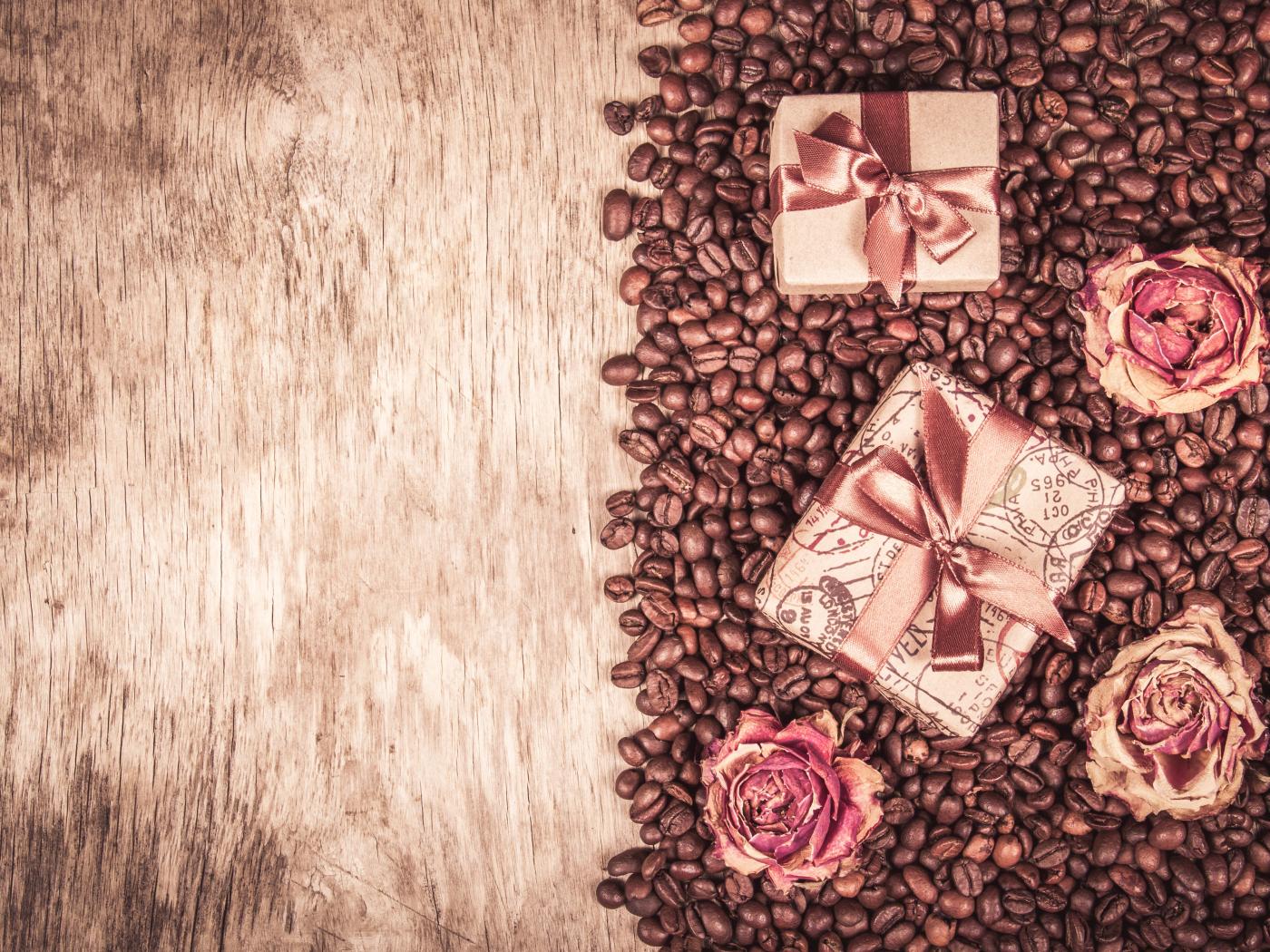 Wallpaper Gifts and roses lie on coffee beans