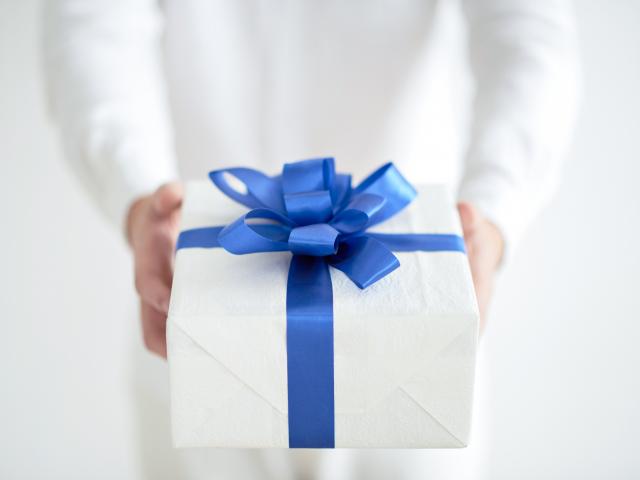 Wallpaper Smiling blue-eyed girl with a big gift in her hands
