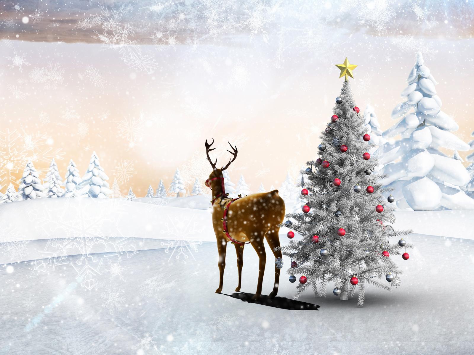 Wallpaper Deer by a dressed up fir tree, christmas card template