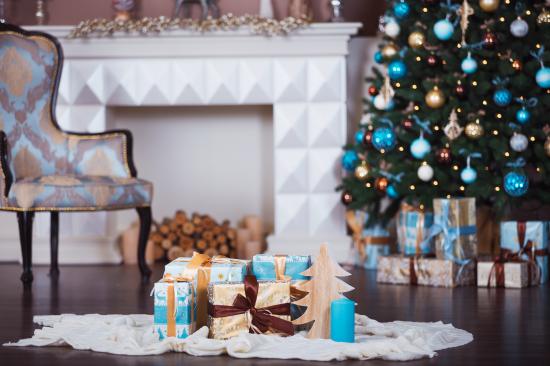 Wallpaper Christmas tree with gifts by the fireplace