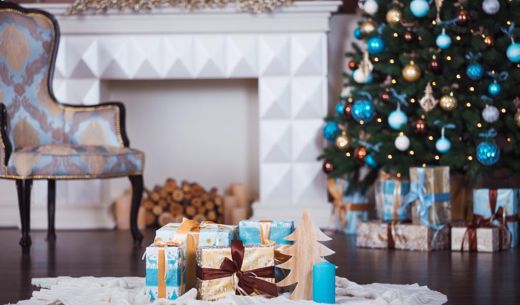 Wallpaper Christmas tree with gifts by the fireplace