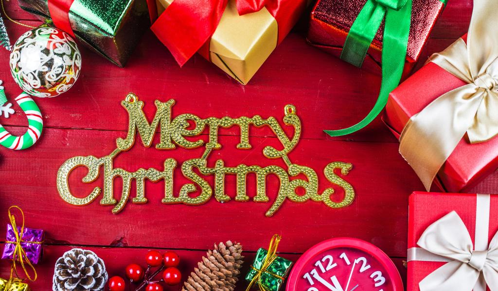 Wallpaper A drawing with the inscription Merry Christmas on the table with Christmas decorations