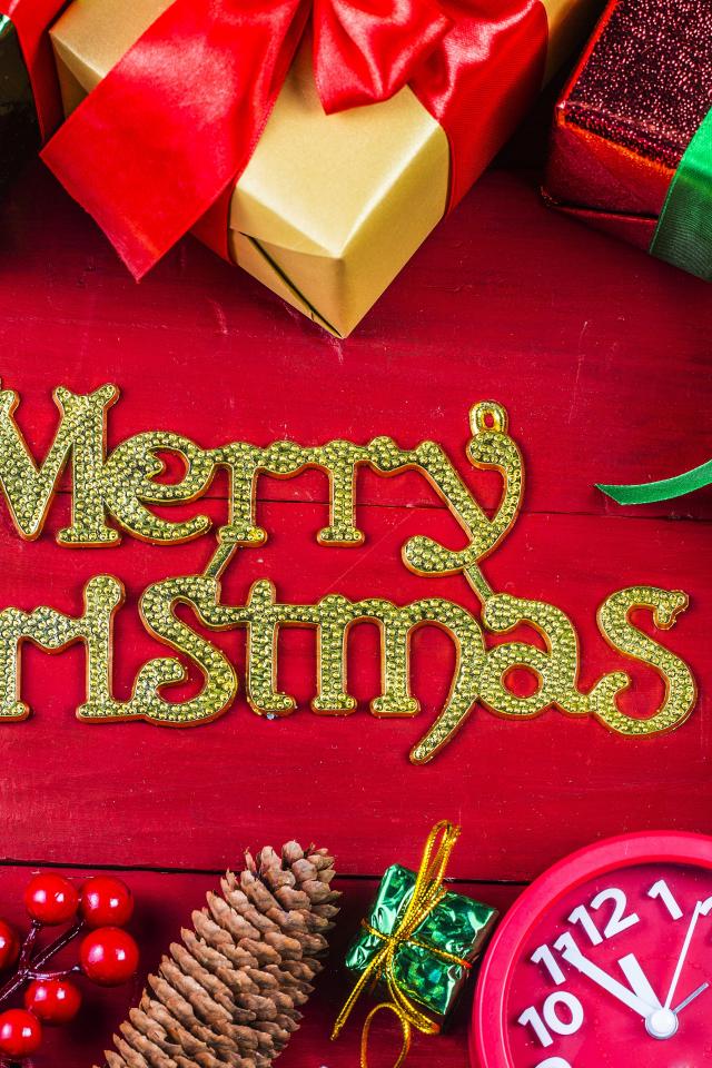 Wallpaper A drawing with the inscription Merry Christmas on the table with Christmas decorations