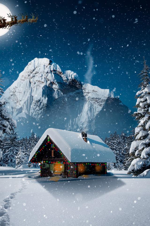 Wallpaper Santa Claus flies over a snowy house for Christmas
