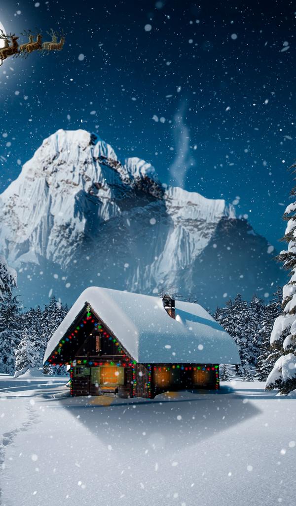Wallpaper Santa Claus flies over a snowy house for Christmas