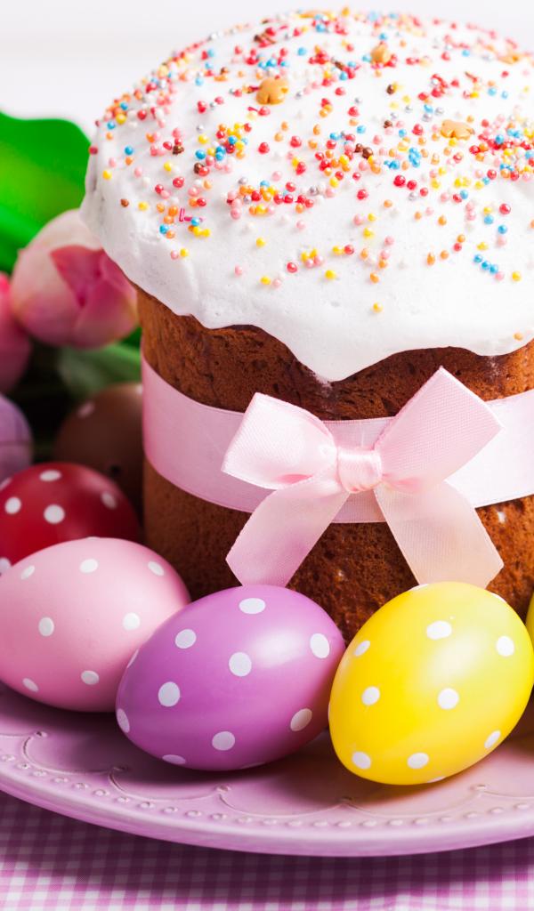 Wallpaper Easter cake with dyed eggs and a bouquet of flowers