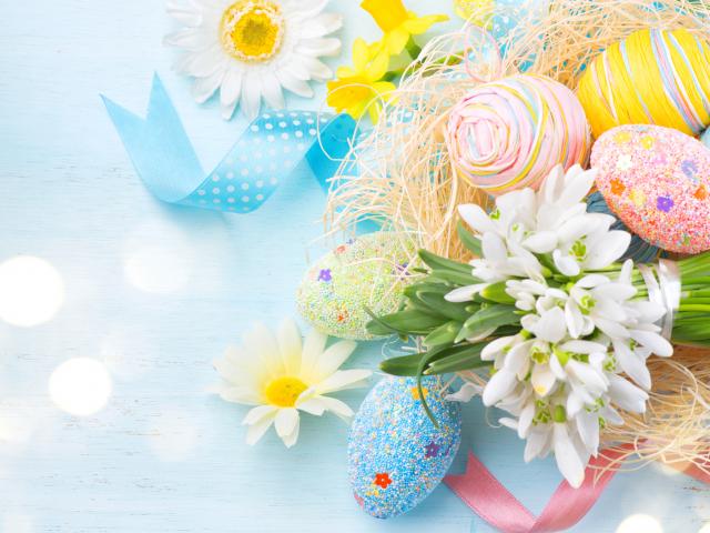 Wallpaper Decorative Easter eggs with a bouquet of snowdrops