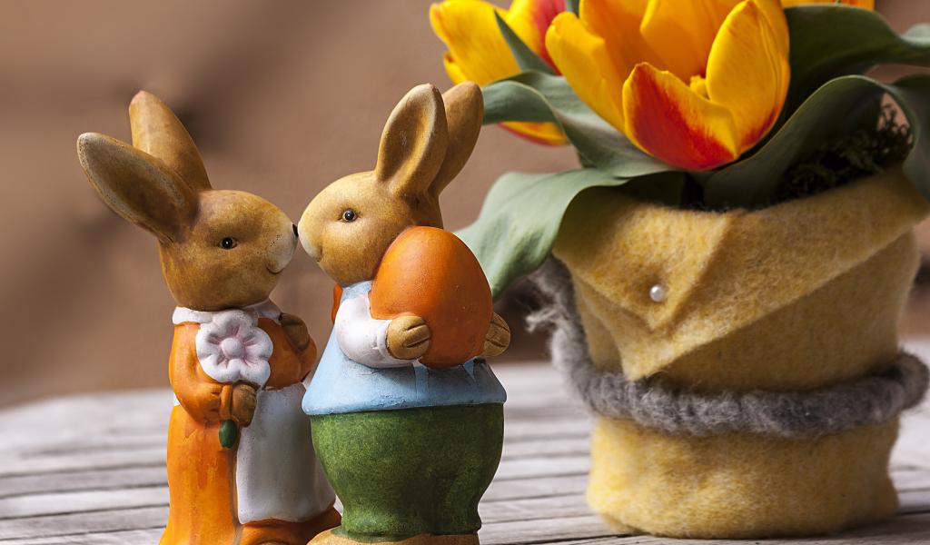 Wallpaper Figurines of Easter bunnies on a table with tulips