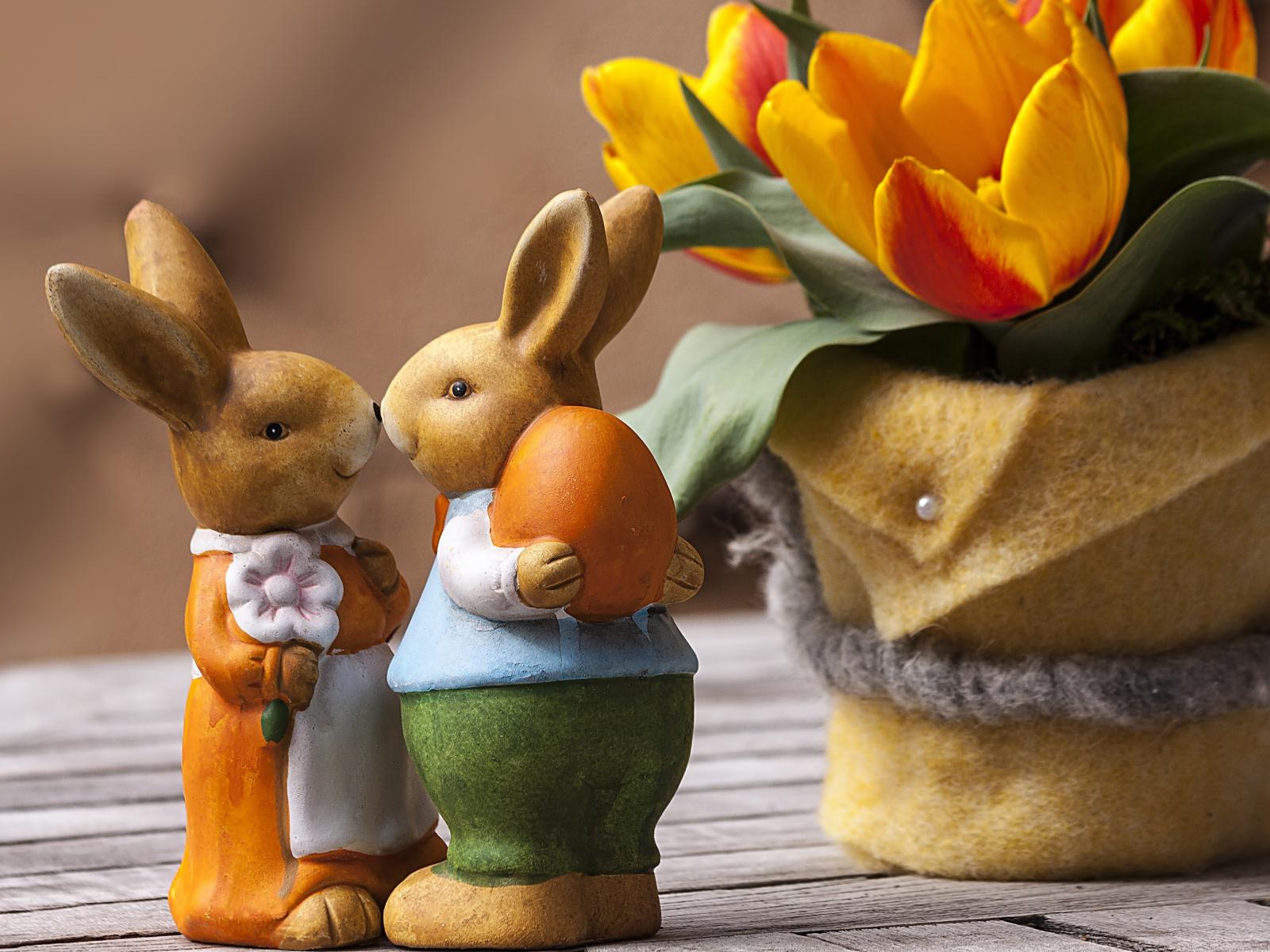 Wallpaper Figurines of Easter bunnies on a table with tulips