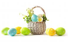 Wallpaper Beautiful Easter cake on a white background with a basket of painted eggs for the holiday Easter