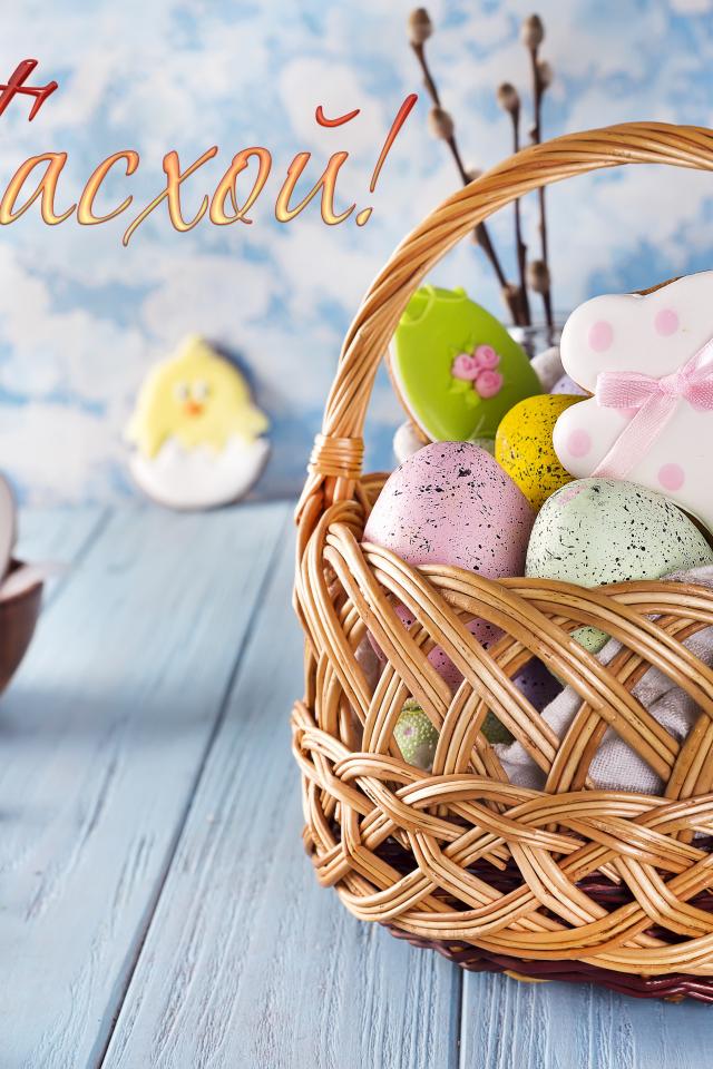 Wallpaper Basket with colored eggs and flowers, card Happy Easter Sunday