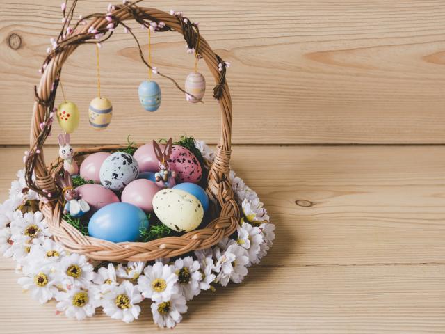 Wallpaper Basket with Easter eggs decorated with flowers.