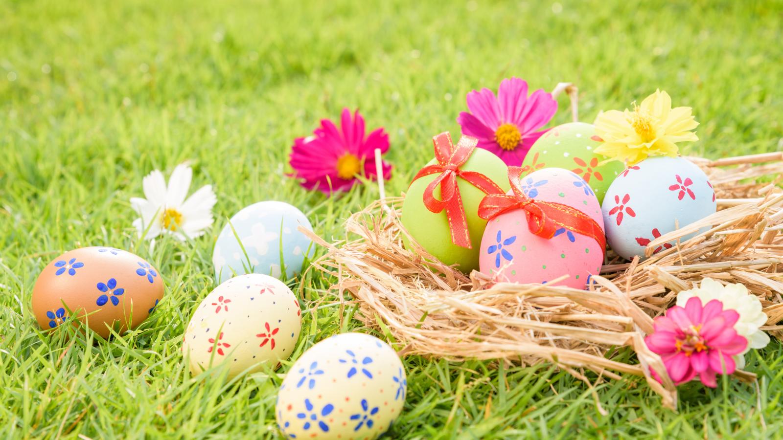 Wallpaper Colorful eggs in a nest on green grass for Easter