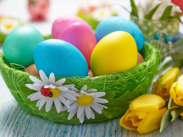 Wallpaper Colorful eggs on a table with tulips for Easter