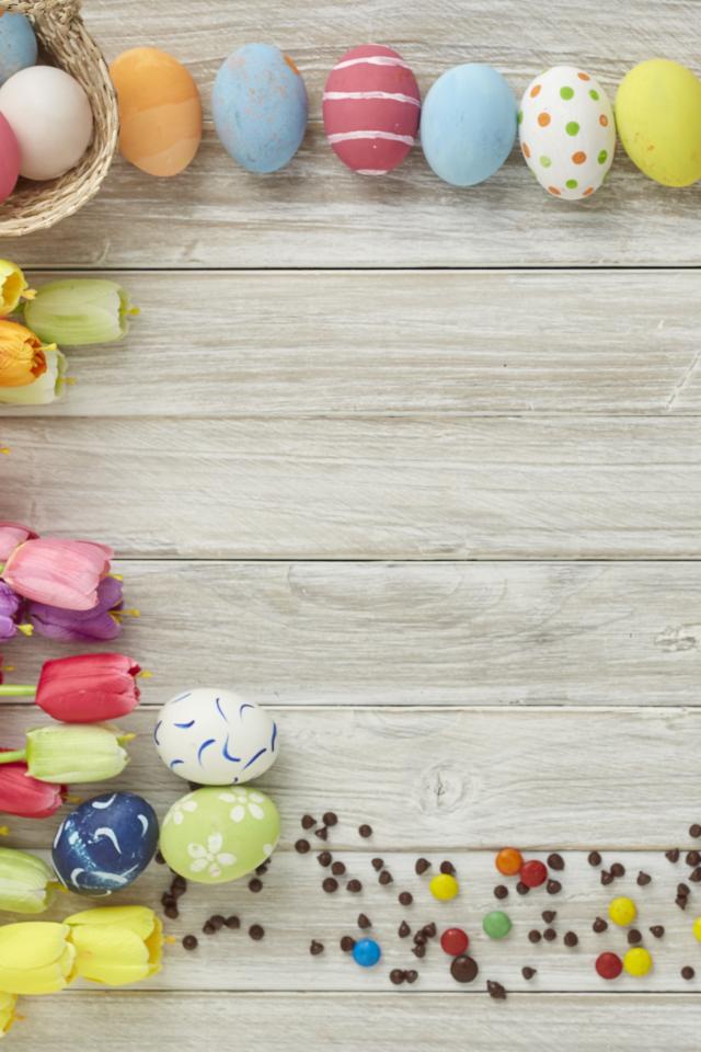 Wallpaper Beautiful multicolored easter eggs with a bouquet of tulips