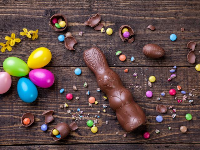 Wallpaper Chocolate bunny and colorful eggs for Easter