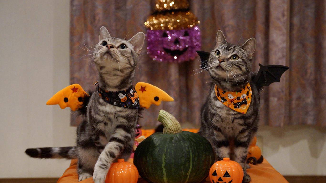 Wallpaper Two gray cats in costumes for the Halloween feast