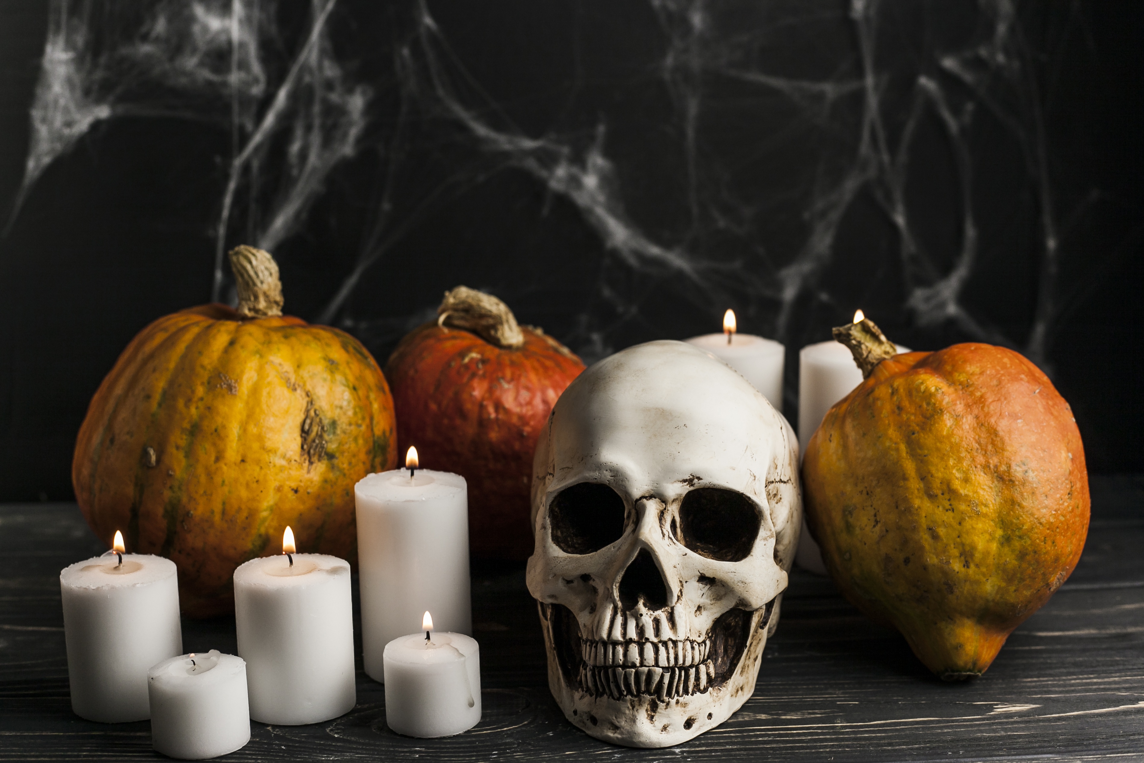 Wallpaper Skull, candles and pumpkins on the table with cobwebs