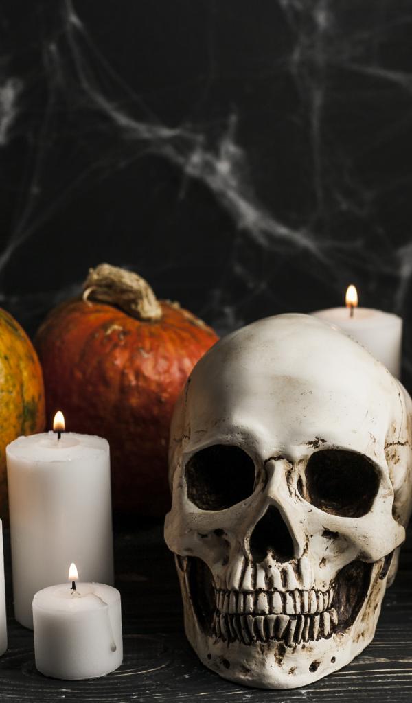 Wallpaper Skull, candles and pumpkins on the table with cobwebs
