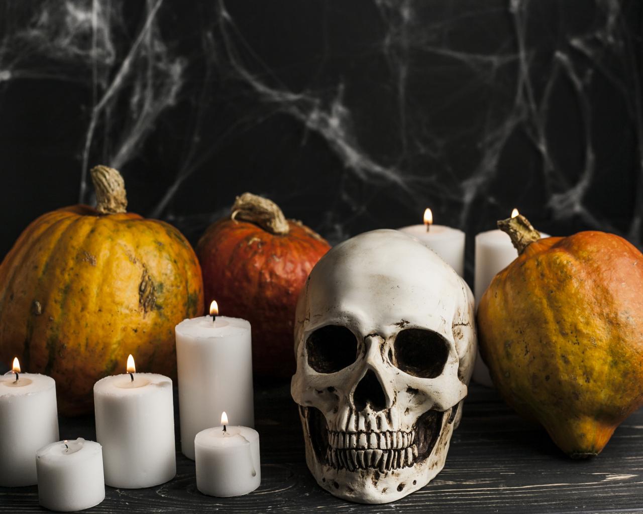 Wallpaper Skull, candles and pumpkins on the table with cobwebs