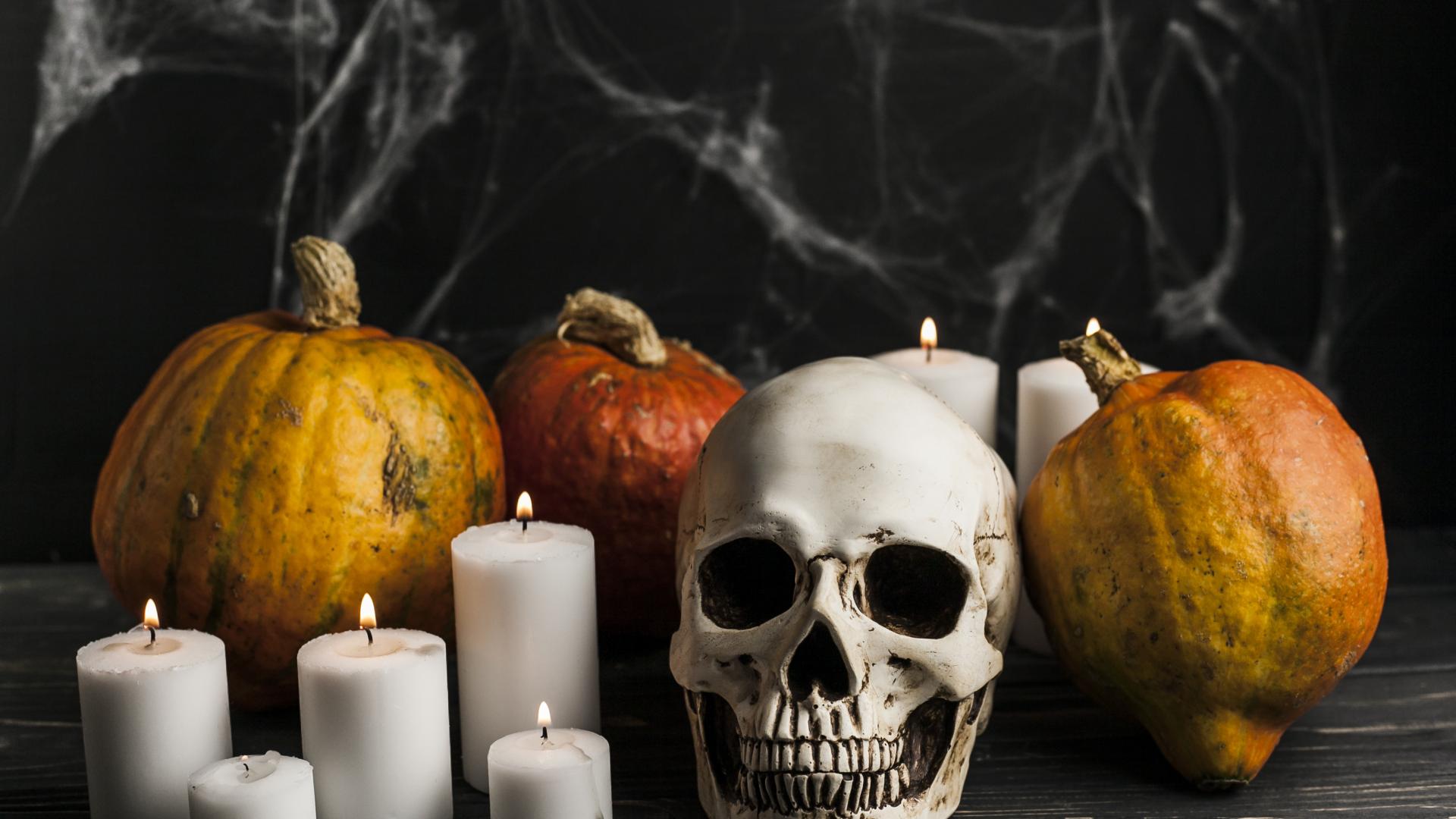 Wallpaper Skull, candles and pumpkins on the table with cobwebs