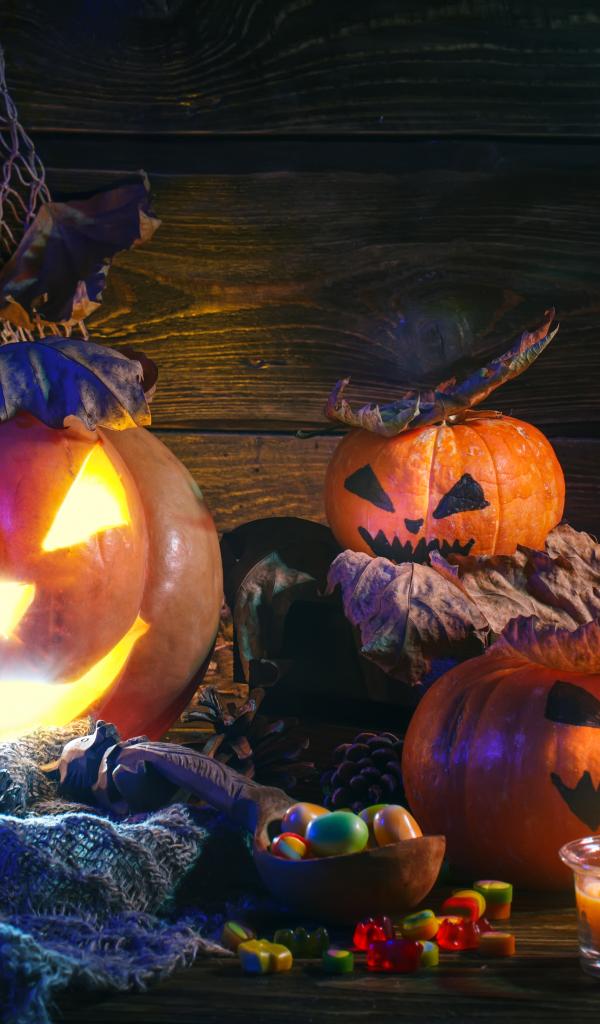 Wallpaper Kids in Halloween costumes with pumpkins on the steps