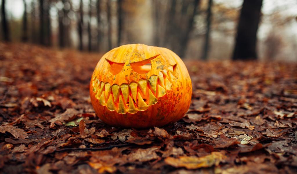 Wallpaper Evil pumpkin in the forest on foliage for Halloween