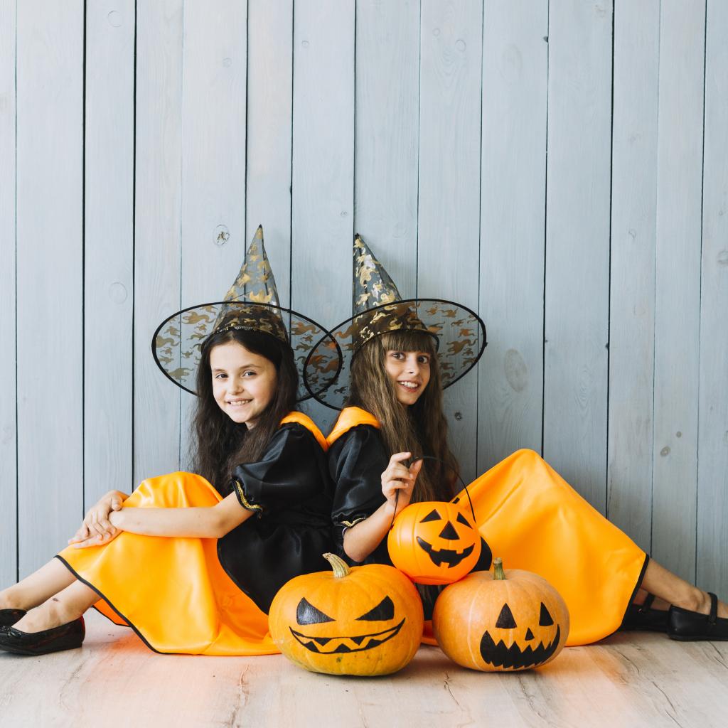 Wallpaper Two little girls with pumpkin in Halloween costumes