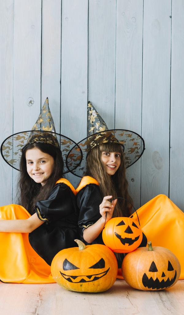 Wallpaper Two little girls with pumpkin in Halloween costumes